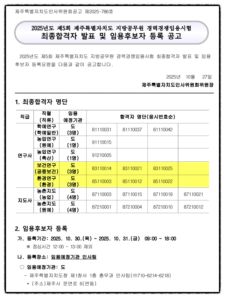 2025년도 제5회 제주특별자치도 보건연구사, 환경연구사 공무원 경력경쟁임용시험 최종합격자 발표 및 임용후보자 등록 공고