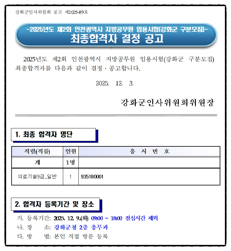 2025년도 제2회 인천광역시 의료기술직공무원 임용시험(강화군 구분모집) 최종합격자 결정