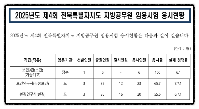 2025년도 제4회 전북특별자치도 보건직(고졸), 보건연구사, 환경연구사 지방공무원 경력경쟁임용 필기시험 응시현황