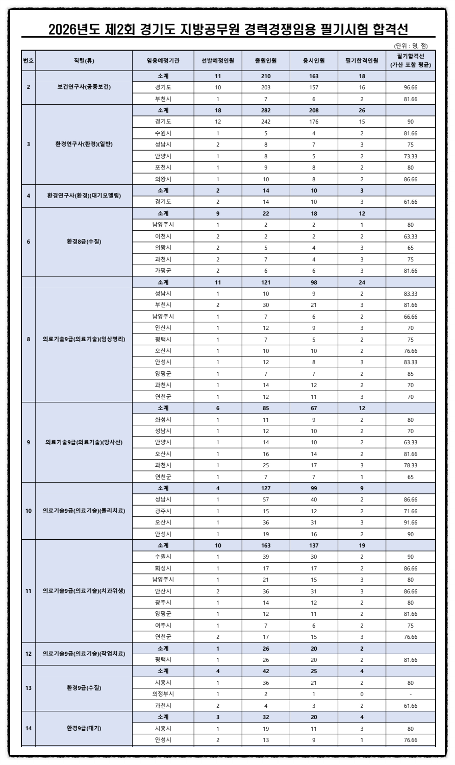 2026년도 제2회 경기도 보건연구사,환경연구사,의료기술직,환경직공무원 경력경쟁임용 필기시험 합격선