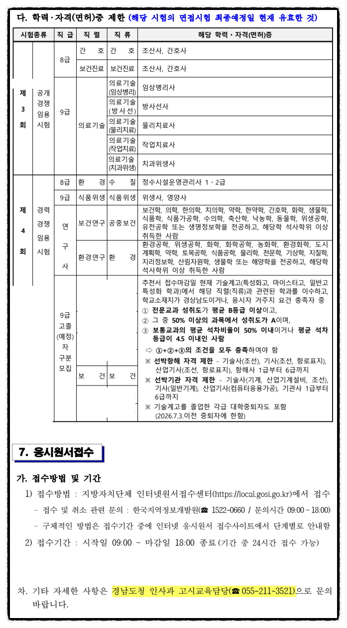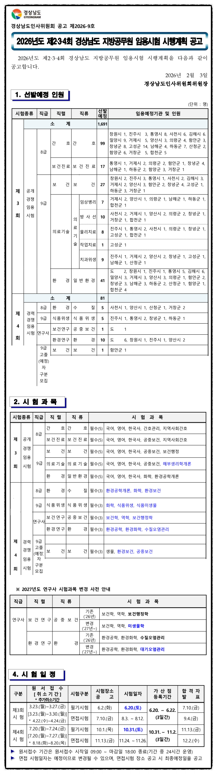 2026년도 제3·4회 경상남도 지방공무원 임용시험 시행계획 공고[간호,보건진료,보건,의료기술,환경,식품위생,보건연구,환경연구]