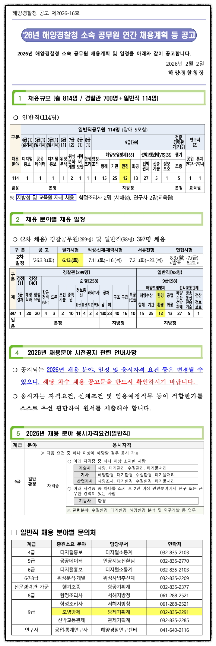 2026년 해양경찰청 소속 공무원(환경직) 연간채용계획 등 공고[사전 공고]