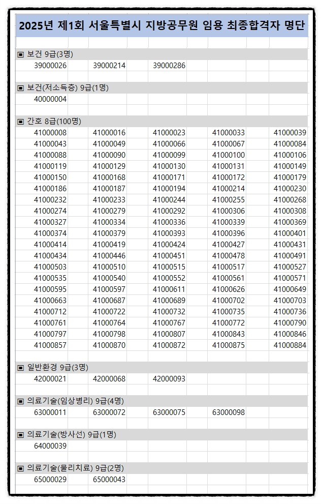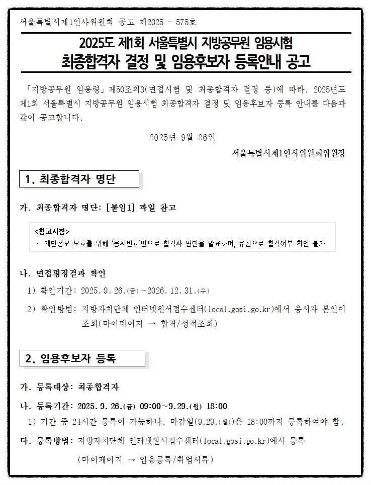 2025년도 제1회 서울특별시 보건직,간호직,환경직,의료기술직공무원 임용시험 최종합격자 결정 및 임용후보자 등록안내 공고