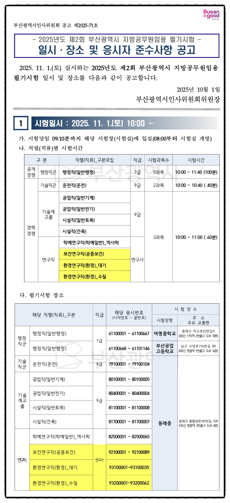 2025년 제2회 부산광역시 보건연구사, 환경연구사 공무원 임용 필기시험 일시·장소 및 응시자 준수사항 공고