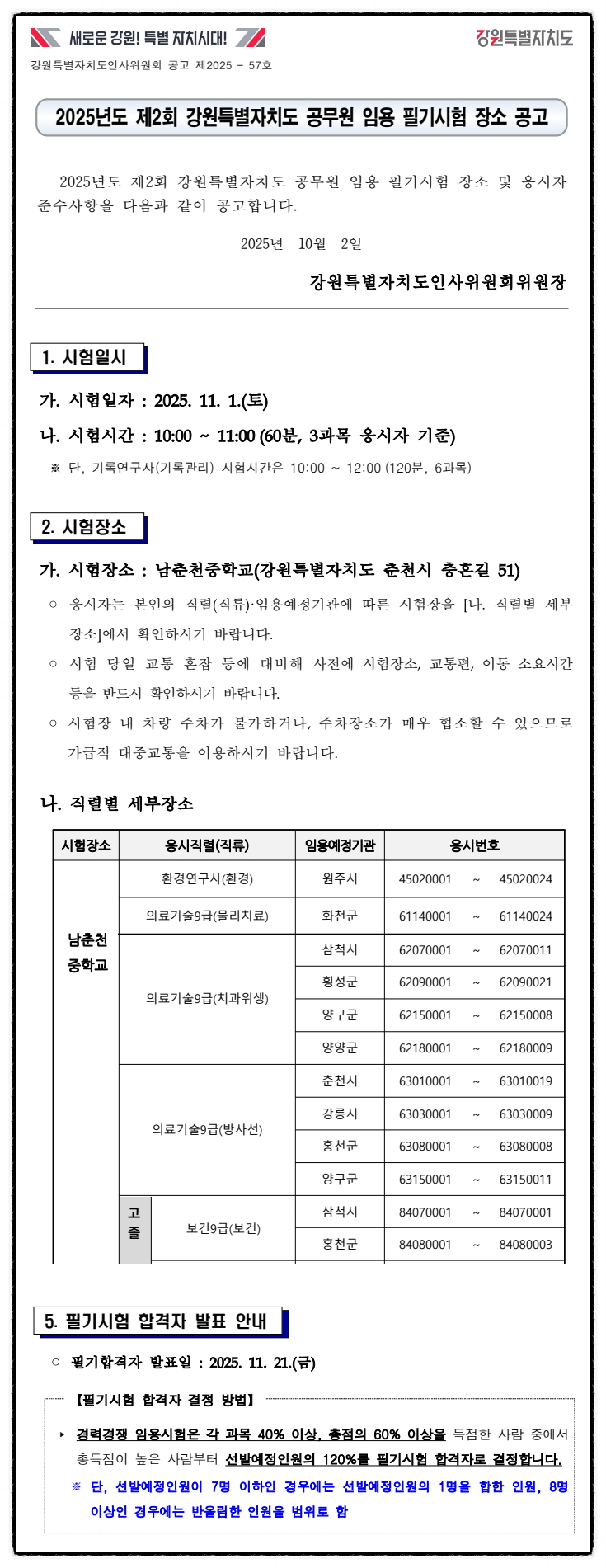 2025년도 제2회 강원특별자치도 환경연구사, 의료기술직, 보건직(고졸) 공무원 임용 필기시험 장소 공고