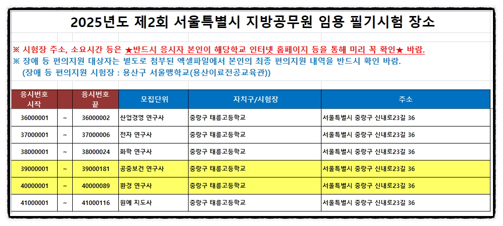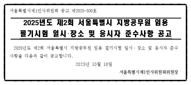 2025년도 제2회 서울특별시 보건연구사, 환경연구사 공무원 임용 필기시험 일시·장소 및 응시자 준수사항 공고