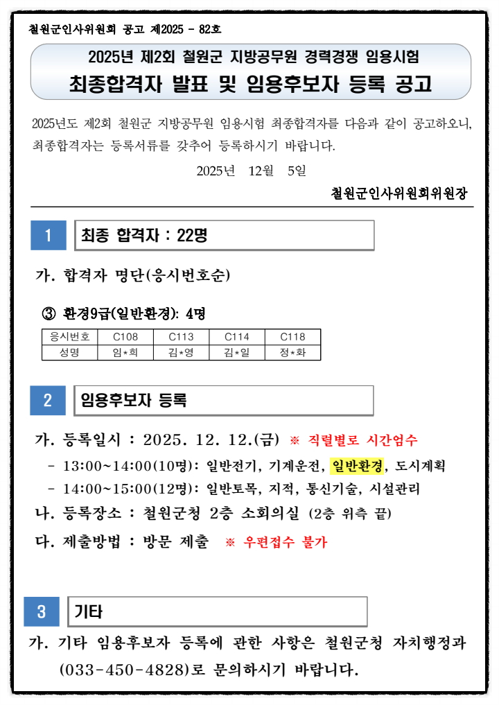 2025년 제2회 강원특별자치도 철원군 환경직 공무원 경력경쟁 임용시험 최종 합격자 발표 및 임용후보자 등록 공고