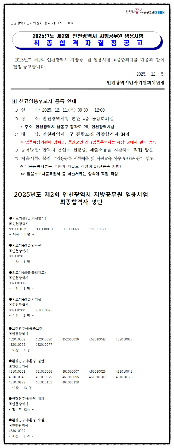 2025년도 제2회 인천광역시 의료기술직, 보건연구사, 환경연구사 지방공무원 임용시험 최종합격자 결정 공고