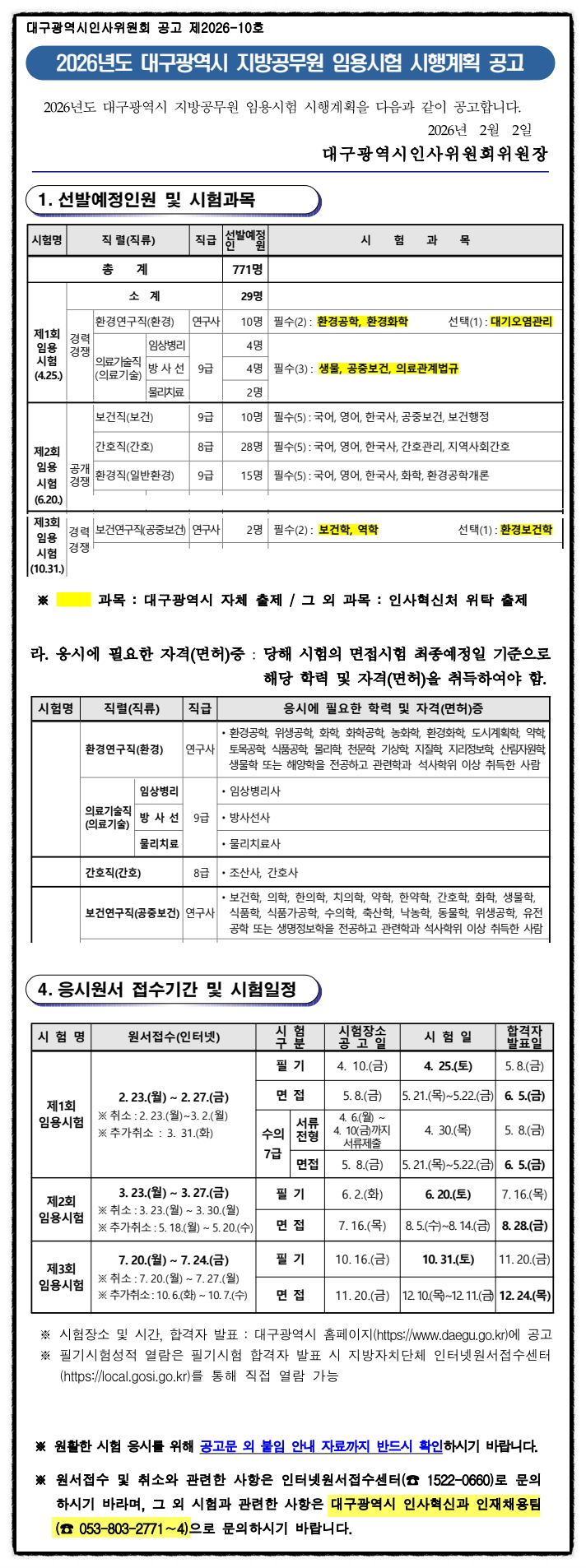 2026년도 대구광역시 지방공무원 임용시험 시행계획 공고 [환경연구사,의료기술직,보건직,간호직,환경직,보건연구사]